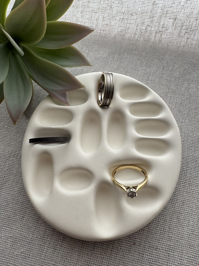 Dieser runde Ringhalter ist die stilvolle Lösung zur Aufbewahrung deiner Lieblingsringe oder kleiner Schmuckstücke. Ob auf dem Schminktisch, Nachttisch oder im Bad – er sorgt für Ordnung und ist zugleich ein eleganter Blickfang.